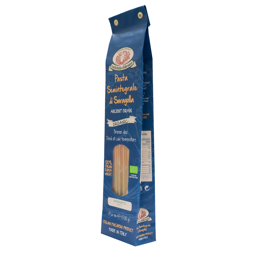 Organic Saragolla Spaghetti pasta—made with 100% stone-ground organic Saragolla wheat semolato (semi-whole wheat flour) and pure spring water—is delicate and nutty in flavor with that perfect al dente bite Rustichella d'Abruzzo pasta is known for.