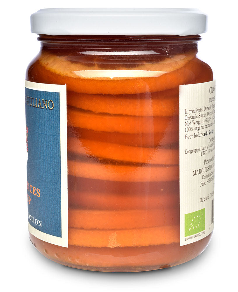 The Marchesi di San Giuliano estate is located on the east coast of Sicily, in the foothills of Mt. Etna, an area boasting some of the most fertile soil in all of Sicily—and an abundance of citrus trees. In this gorgeous product, they've preserved the prized Sicilian blood orange. The oranges are sliced into 1/4-inch rounds, blanched in water to remove the bitterness and then slowly cooked in simple syrup (made with organic cane sugar). The candied orange slices are then gently layered into jars and topped with a reduction of the cooking liquid blended with a touch of organic brandy.