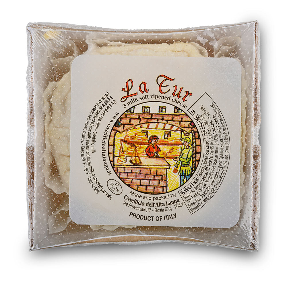 Often described as “irresistible”, La Tur is a modern twist on Robiola, the style of soft-ripened cheese traditional to Italy’s Piedmont region. A blend of cow, goat and sheep’s milk yields a complex flavor profile that’s buttery and rich with a lactic tang. The core of the cheese has the texture of loosely packed snow that as it warms, becomes creamy, oozing from the center.