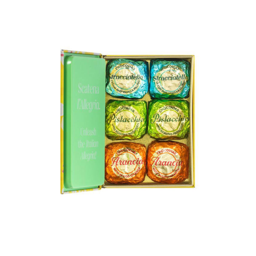 We love settling down with a good book—especially when it's filled with chocolate. This miniature book-shaped tin filled with an assortment of chocolate in the following flavors: Pistachio with toffee and nibs; Stracciatella with cream; and Orange with Sicilian Blood Orange filling.