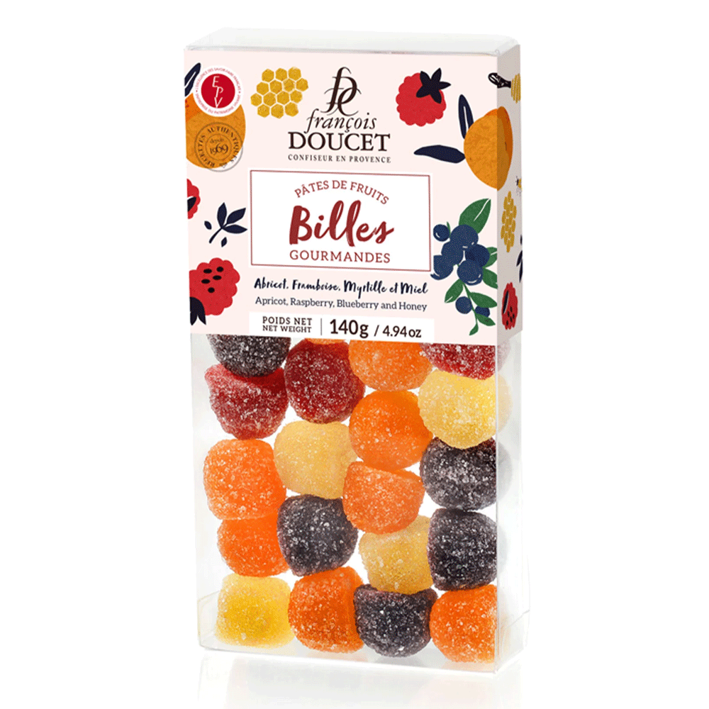 François Doucet's Billes Gourmandes (gourmet marbles) are an assortment of three pâtes de fruits in three flavors—Provençal apricot, raspberry and blueberry—and jellied Provençal lavender honey gems.