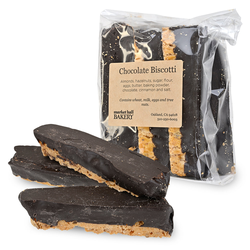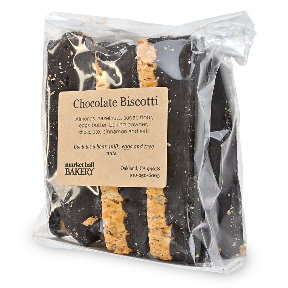 Made with a combination of almonds and hazelnuts, our housemade Chocolate Biscotti are crisp, crumbly and aromatic thanks to a double-dose of both ground cinnamon and cinnamon oil. These cookies also get a half coat of Guittard chocolate for an extra special touch. Just like the old days, our biscotti are made entirely by hand from start to finish.
