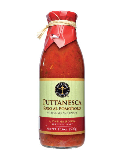 Puttanesca Sauce is a classic, Southern Italian tomato sauce typically known for being tangy and a bit salty, due to addition of capers and olives (and in some cases anchovies). This recipe, from Casina Rossa of Abruzzo, is a sweet and savory mix of capers, olives, Italian pine nuts and raisins. Toss with roasted cauliflower or pasta, or bake rock cod fillets in a layer of sauce in a glass baking dish. Traditionally, Puttanesca Sauce is served with spaghetti, although it also goes well with penne, bucatini, linguine and orecchiette.