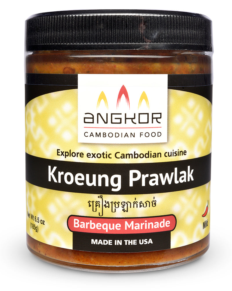 Angkor Cambodian Food's Kroeung Prawlak BBQ marinade is vibrant and fragrant from lots of lemongrass, garlic and onion. The addition of turmeric adds a rich, earthiness, while tamarind lends an underlying tang and chile peppers bring just the right amount of tongue-tingling heat. Cane sugar balances out the spice, while also helping the meat caramelize when grilled. One jar is enough paste to marinate about 2 1/2–3 pounds of meat.