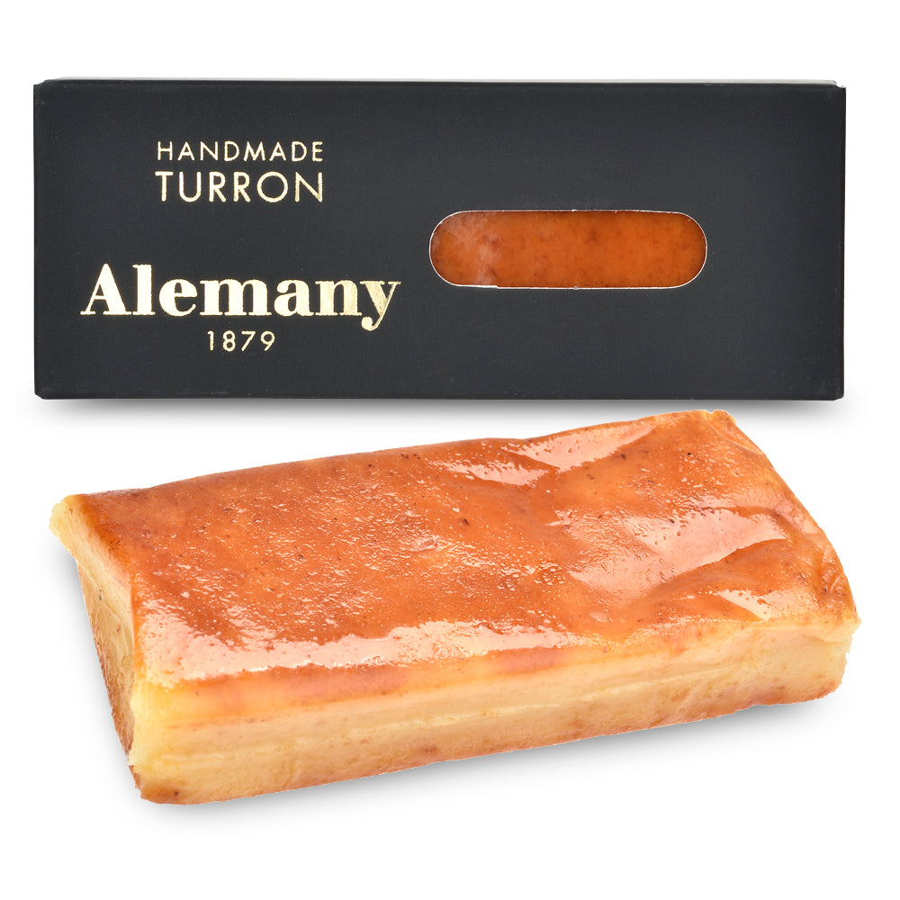Also known as turrón de Yema, this marzipan turrón is unlike anything else. Typically, turrón is made with egg whites (similar to French nougat), but this version uses egg yolks instead, lending it a distinct richness. Made with ground almonds, rosemary honey, vanilla and a touch of white chocolate, this holiday treat becomes even more decadent from the caramelized sugar crust.