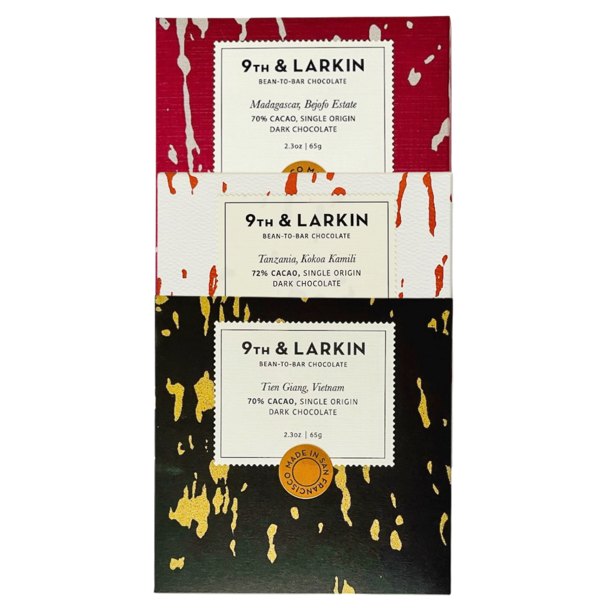 Until 2017, Brian and Lan of 9th and Larkin, were working in the tech industry, not the chocolate business. But that didn’t stop the all-around food enthusiasts from making their own chocolate bar—entirely from scratch—in their tiny San Francisco kitchen. Impressed with the results (and the fun they had), the husband-and-wife team officially established 9th & Larkin.
