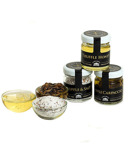 Your trio truffle gift set includes one jar each of truffle honey, chopped truffle carpaccio and black truffle salt.