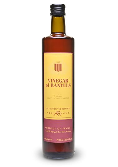 Across the Mediterranen Sea from Provence, just north of the Spanish/French border lies Banyuls-sur-Mer, a beautiful coastal town that is home to an incredible, slightly sweet wine made of 90% Grenache grapes. The vinegar is aged 4-6 years in oak barrels stored outdoors, exposing the vinegar to the cool sea breezes and chilly winds off the Pyrenees. The fully developed flavor is slightly bitter with nutty undertones and a sweet vanilla aroma.
