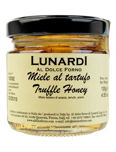 I would describe Lunardi Black Truffle Honey as black diamonds suspended in liquid gold. Its blend of earth and blossom is a marriage of contrasts. Sweet and savory, assertive and subtle, it drizzles as well on chevre as it does an a crumpet. This honey is the one plus ultra of palate indulgence.